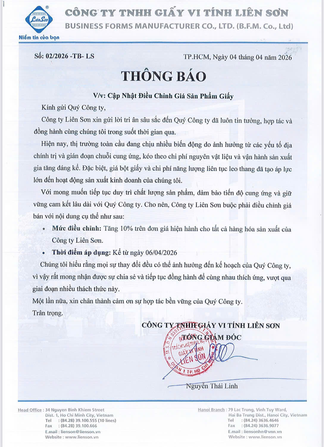 Theo thông báo số 02/2026 -TB- LS ban hành ngày 04/04/2026, Công ty Liên Sơn đã điều chỉnh giá mới do áp lực từ chi phí bột giấy và năng lượng leo thang trên thị trường thế giới.