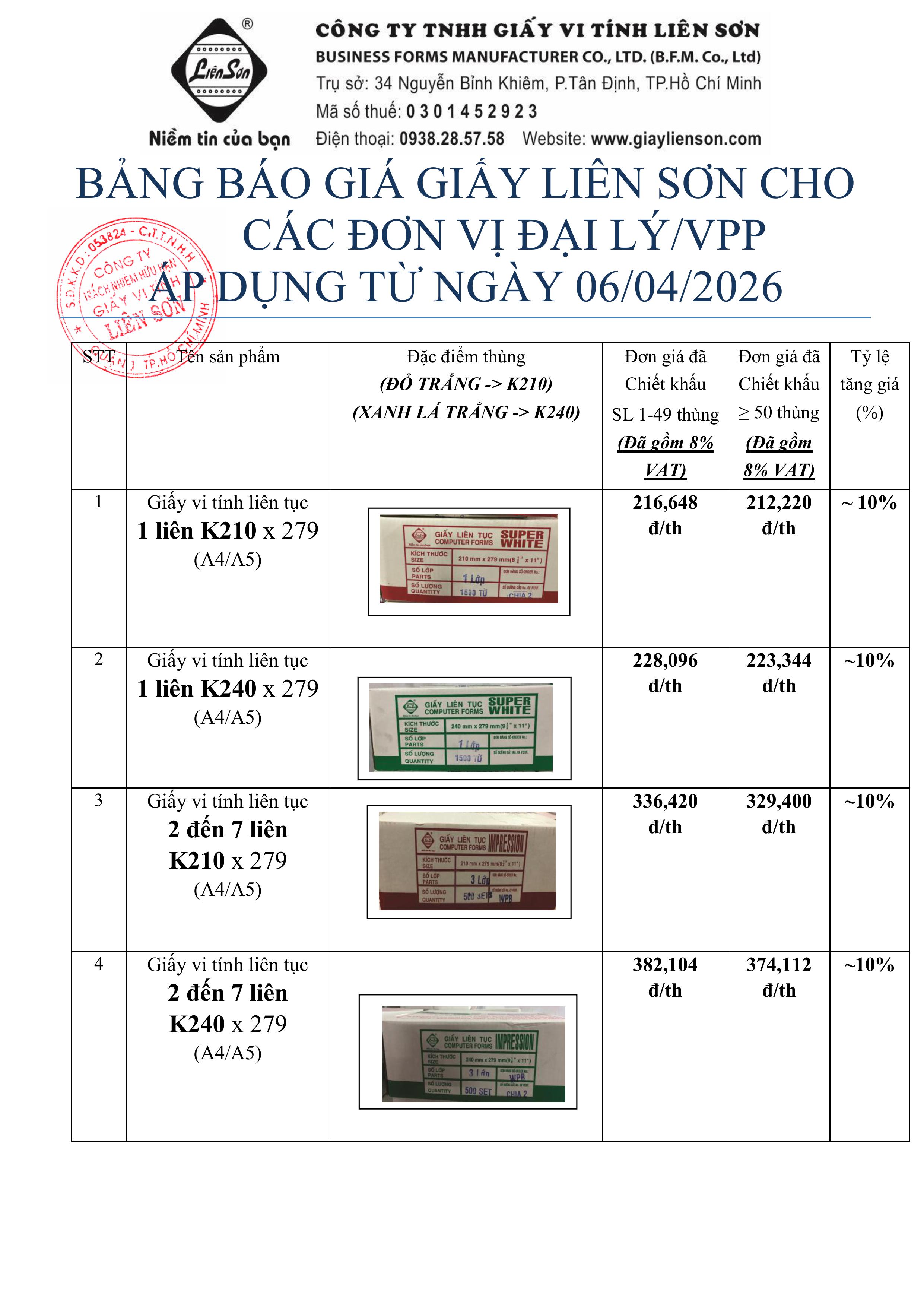 Để quý khách hàng chủ động hơn trong việc lập kế hoạch ngân sách vật tư cho quý mới, KN&TC xin cập nhật bảng giá chi tiết cho các dòng giấy vi tính Liên Sơn. Theo thông báo mới nhất số 02/2026 -TB- LS, từ ngày 06/04/2026, giá các sản phẩm giấy in liên tục sẽ có sự điều chỉnh tăng nhẹ. KN&TC hy vọng nhận được sự cảm thông và tiếp tục ủng hộ từ phía quý doanh nghiệp để cùng nhau vượt qua giai đoạn thách thức về chi phí vận hành hiện nay.