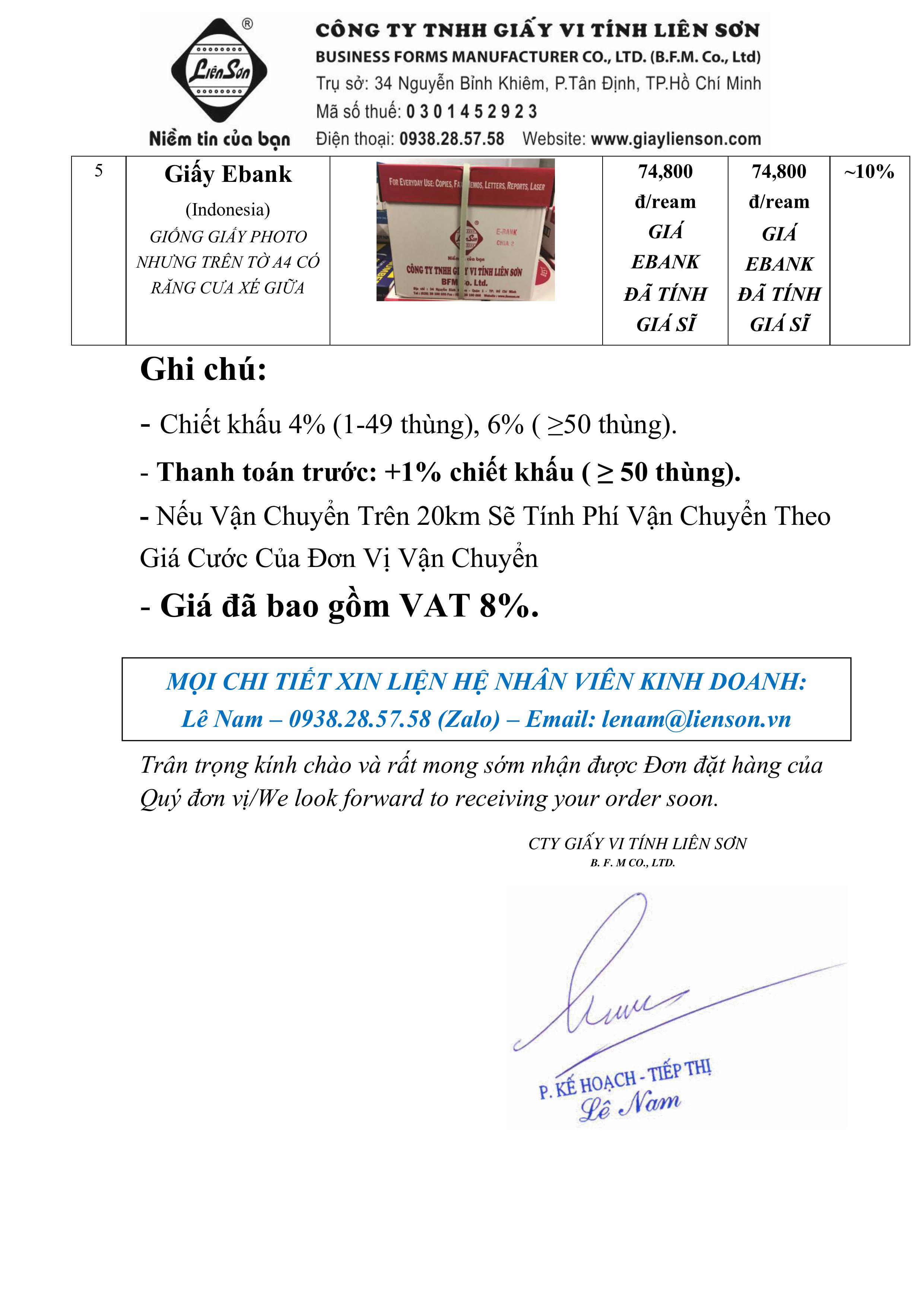1. Thông báo chính thức về việc điều chỉnh giá sản phẩm giấy Liên Sơn