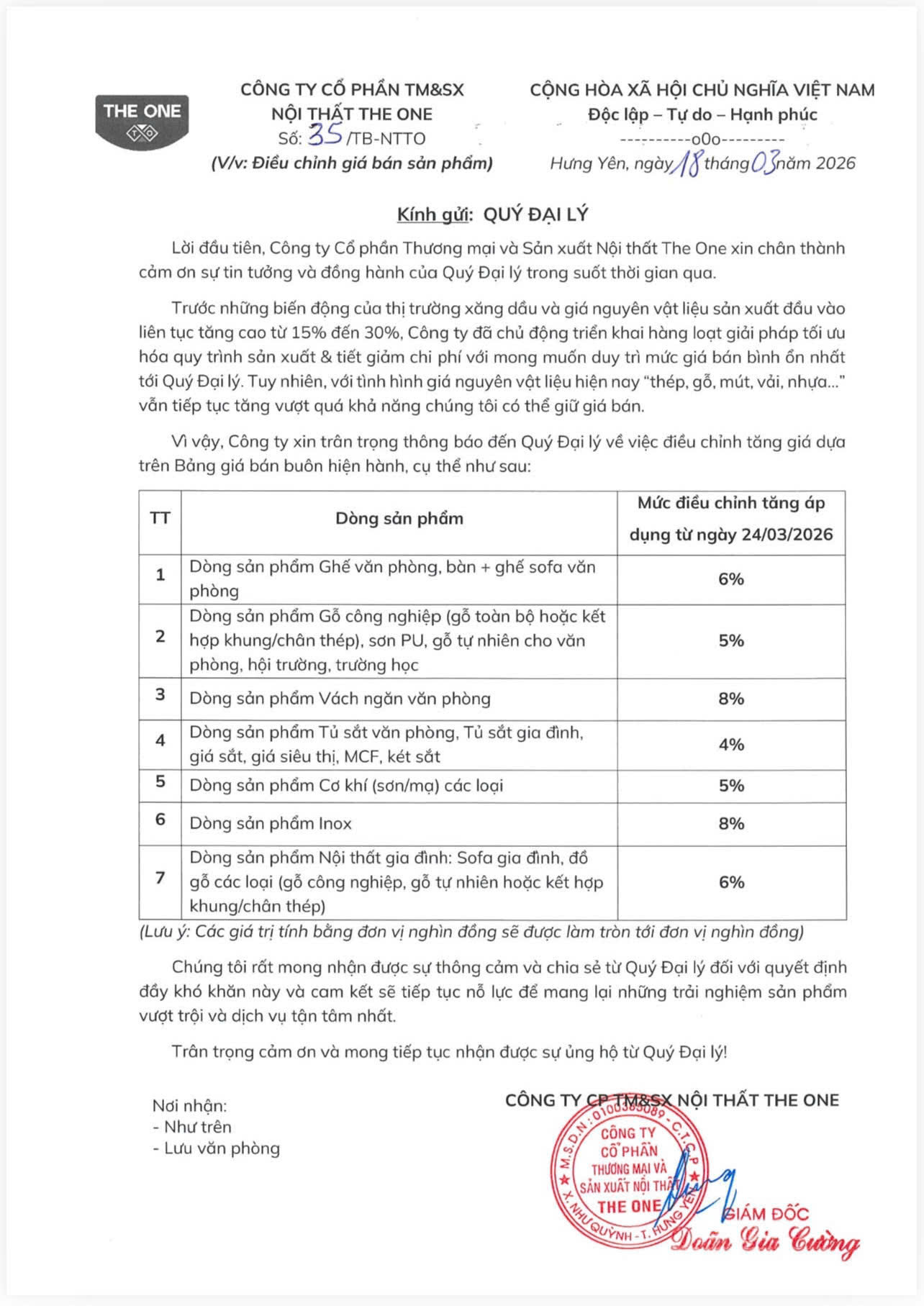Trong bối cảnh thị trường nguyên vật liệu liên tục biến động, ngành nội thất văn phòng và gia đình cũng trực tiếp chịu ảnh hưởng mạnh mẽ từ việc tăng giá đầu vào như thép, gỗ, nhựa, mút và vải. Mới đây, Nội thất Hòa Phát (The One) đã chính thức gửi thông báo điều chỉnh giá bán trên toàn bộ hệ thống sản phẩm.