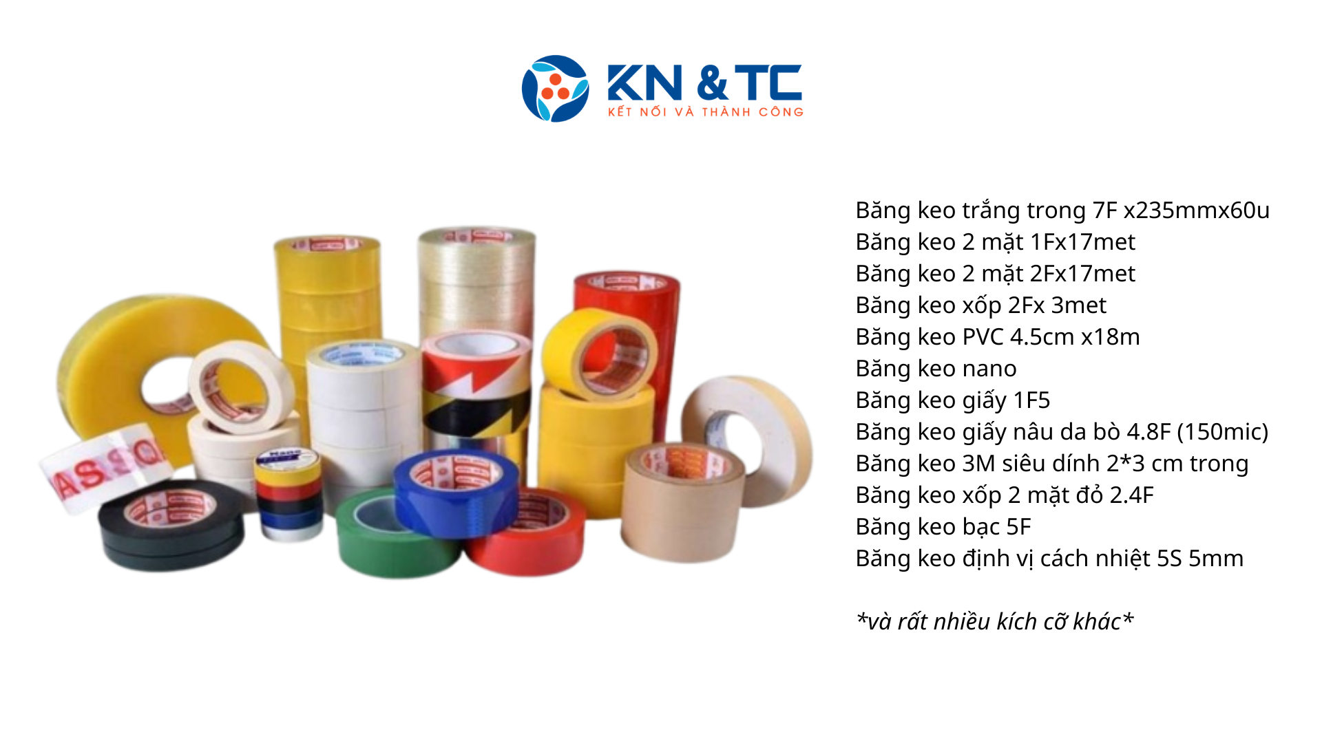 Riêng với dòng sản phẩm băng keo, KN&TC tự hào mang đến một hệ sinh thái sản phẩm cực kỳ đa dạng, đáp ứng trọn vẹn mọi nhu cầu từ đóng gói công nghiệp đến các ứng dụng chuyên kỹ thuật.